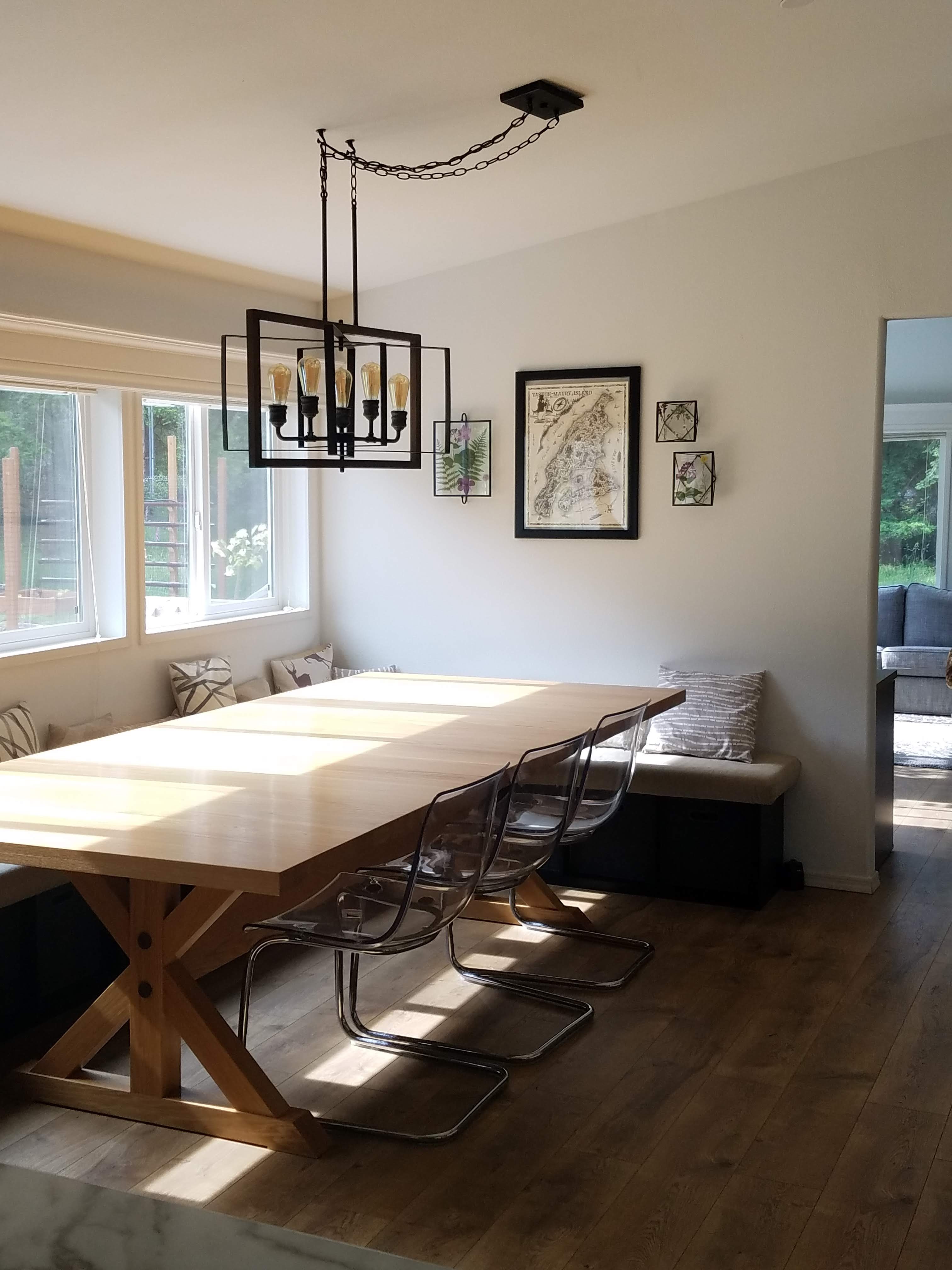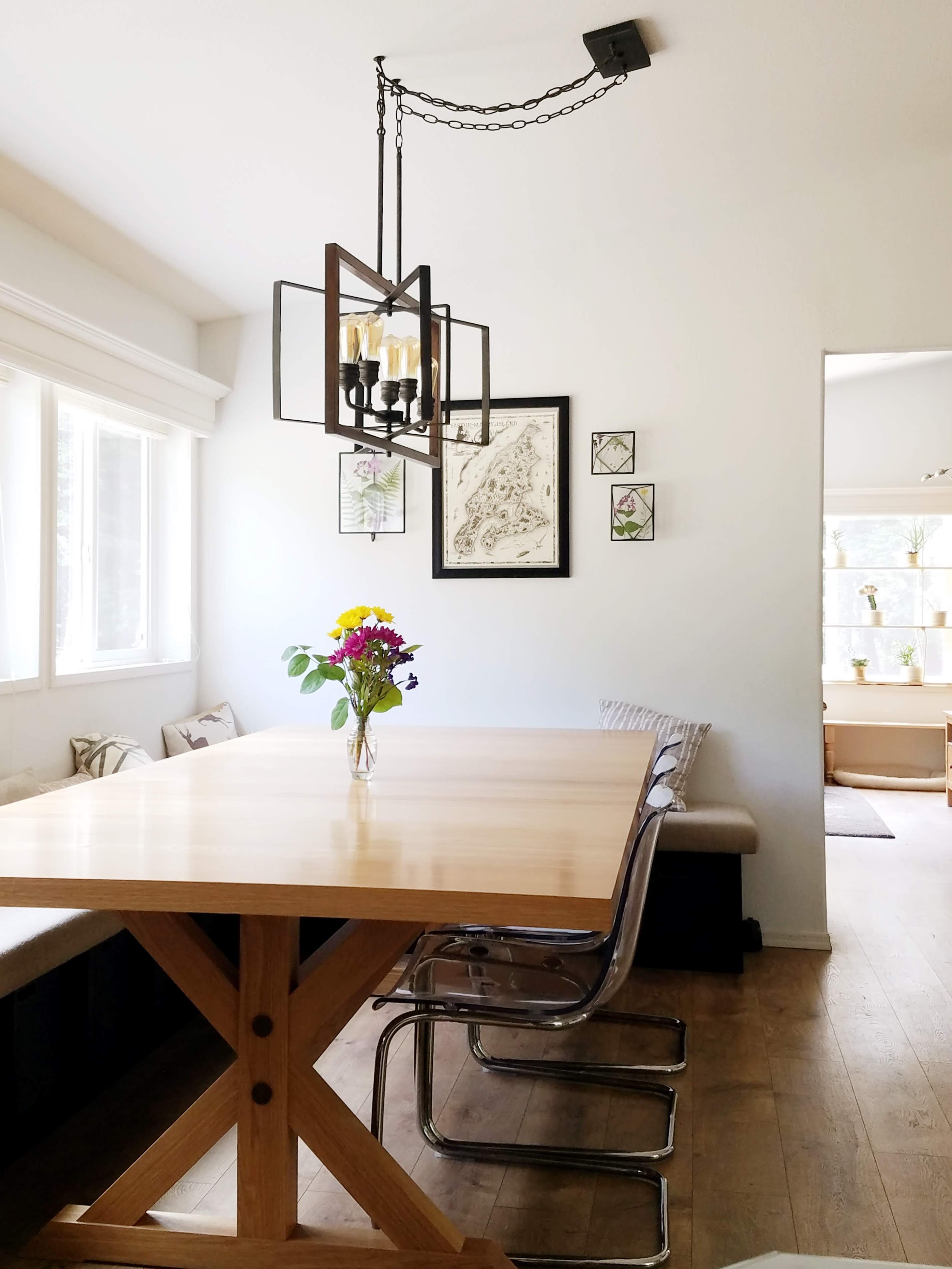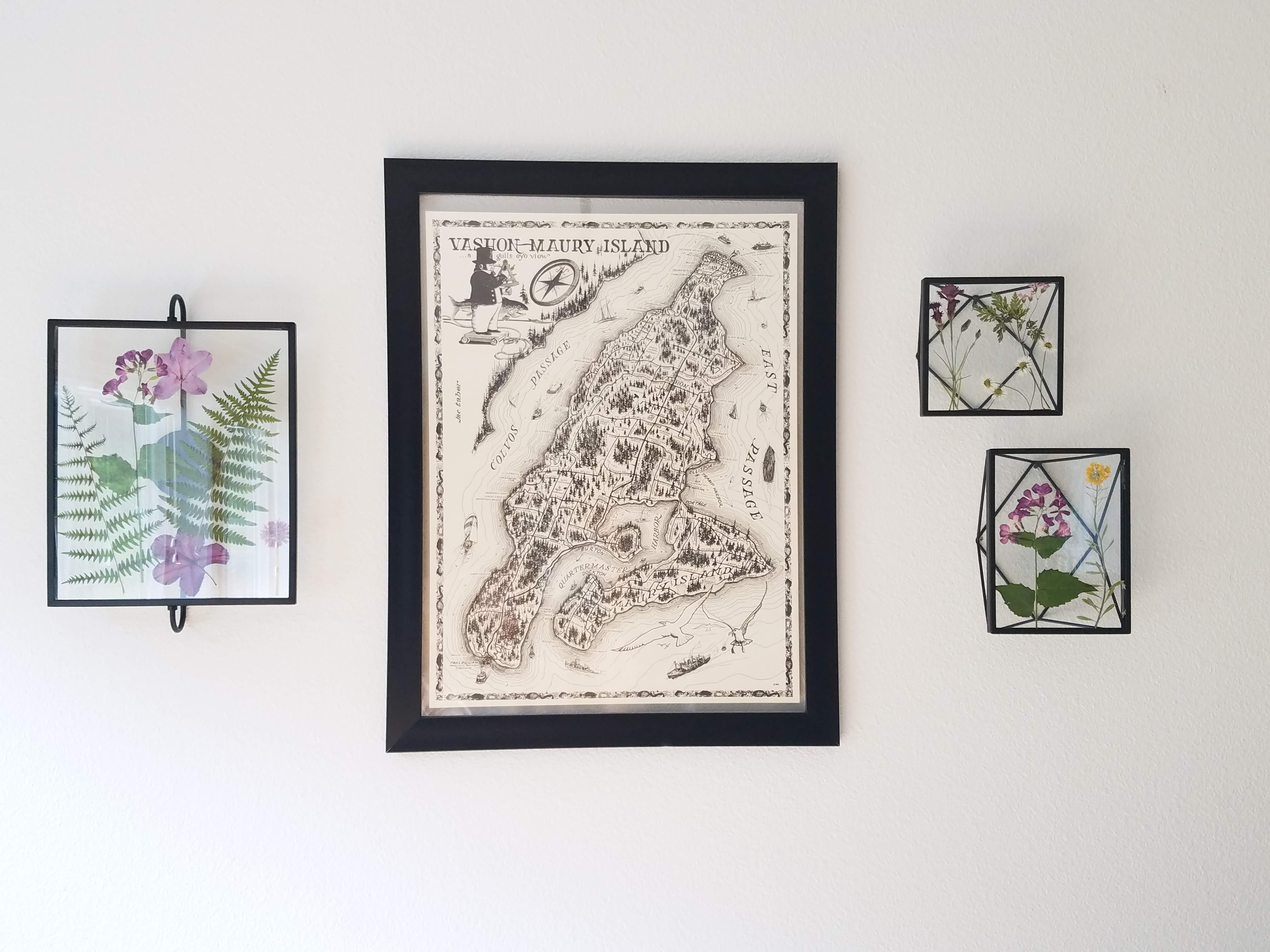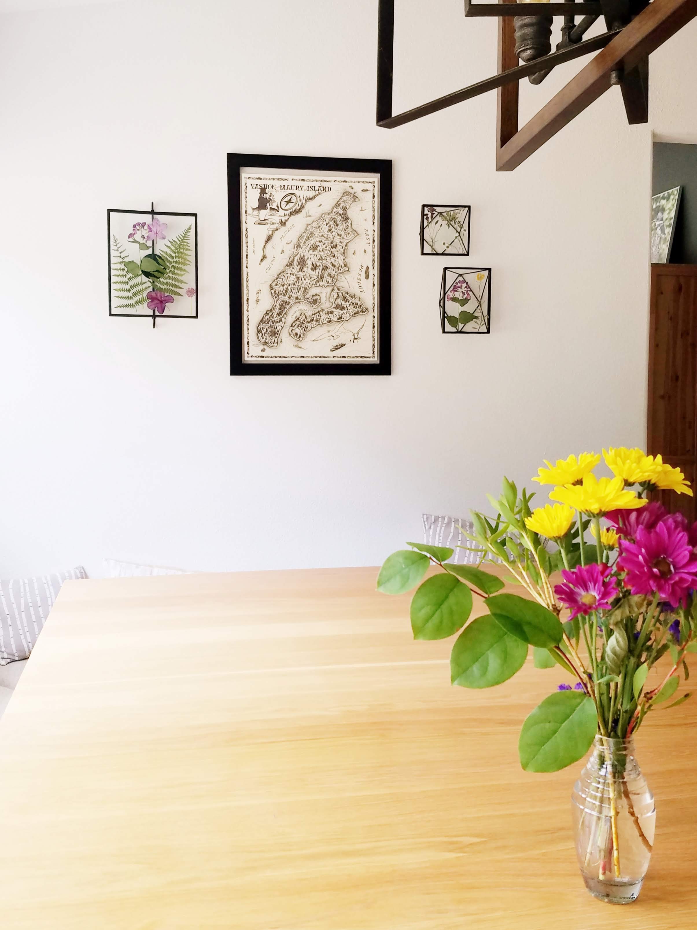 For the frames, I found floating glass frames in a variety of sizes on Amazon. I wanted black frames to match our fun black and white framed map of Vashon Island. I love the three-dimensional, geometric style of these frames as well. I think the geometric and black iron aspects of these frames tie in well with our dining room light fixture and help to tie the whole room together. When arranging the flowers, I found that the glass in my frames fit tightly enough that I didn’t need to glue them in place. I would, however, recommend cleaning both sides of each pane of glass thoroughly before beginning to arrange your flowers, because nothing ruins the overall effect like a fingerprint, or god forbid, a stray dog hair!