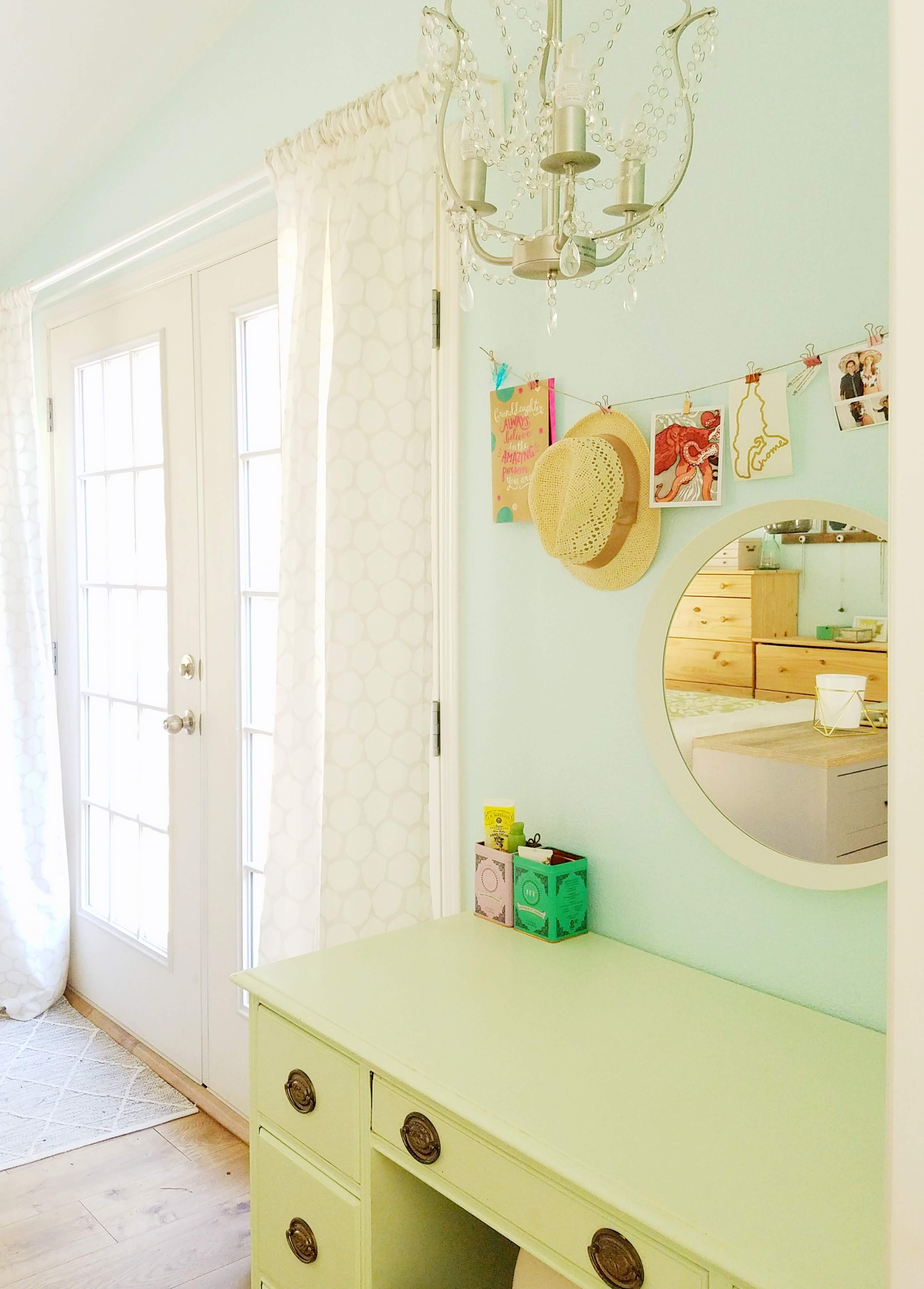 My mom gave me this old desk that used to be in my great-grandfather’s office. No one in the family was really using it, and it had some watermarks on the top and needed to be refinished. I decided to sand it down and paint it mint green. To me it feels like such a refreshing color, like eating a bowl of mint chocolate chip ice cream. I used the original desk hardware to keep a little bit of a vintage feel. I also added a funky swivel chair, and a round mirror and chandelier from IKEA.