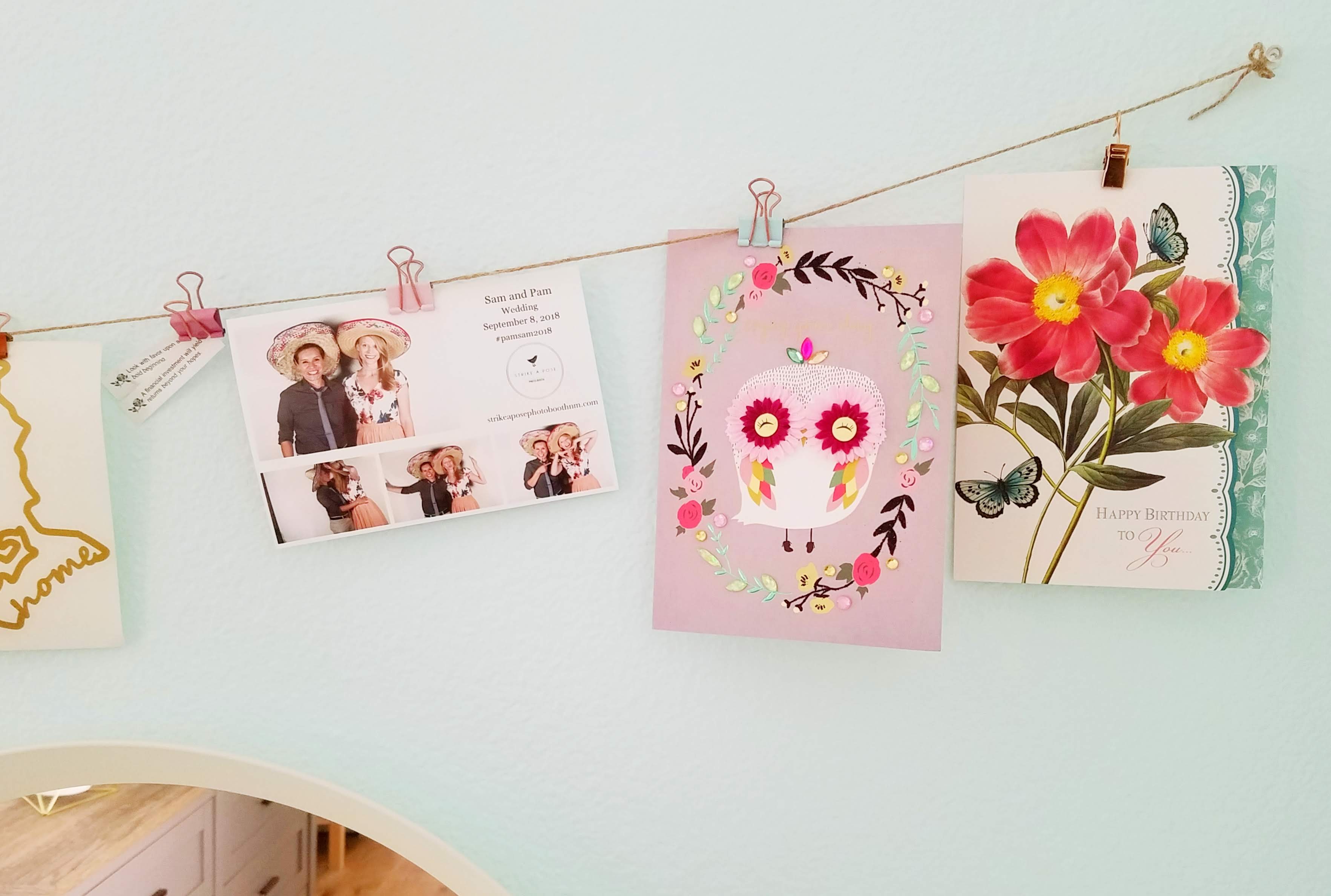 It’s always fun to have a place to hang mementos and birthday cards–usually I keep my birthday cards up all year until I get more for my next birthday. To create a hanging system for them, I just put a couple of clear thumbtacks on the wall and tied some brown twine onto them. A package of colorful binder clips works well for hanging things on the string.