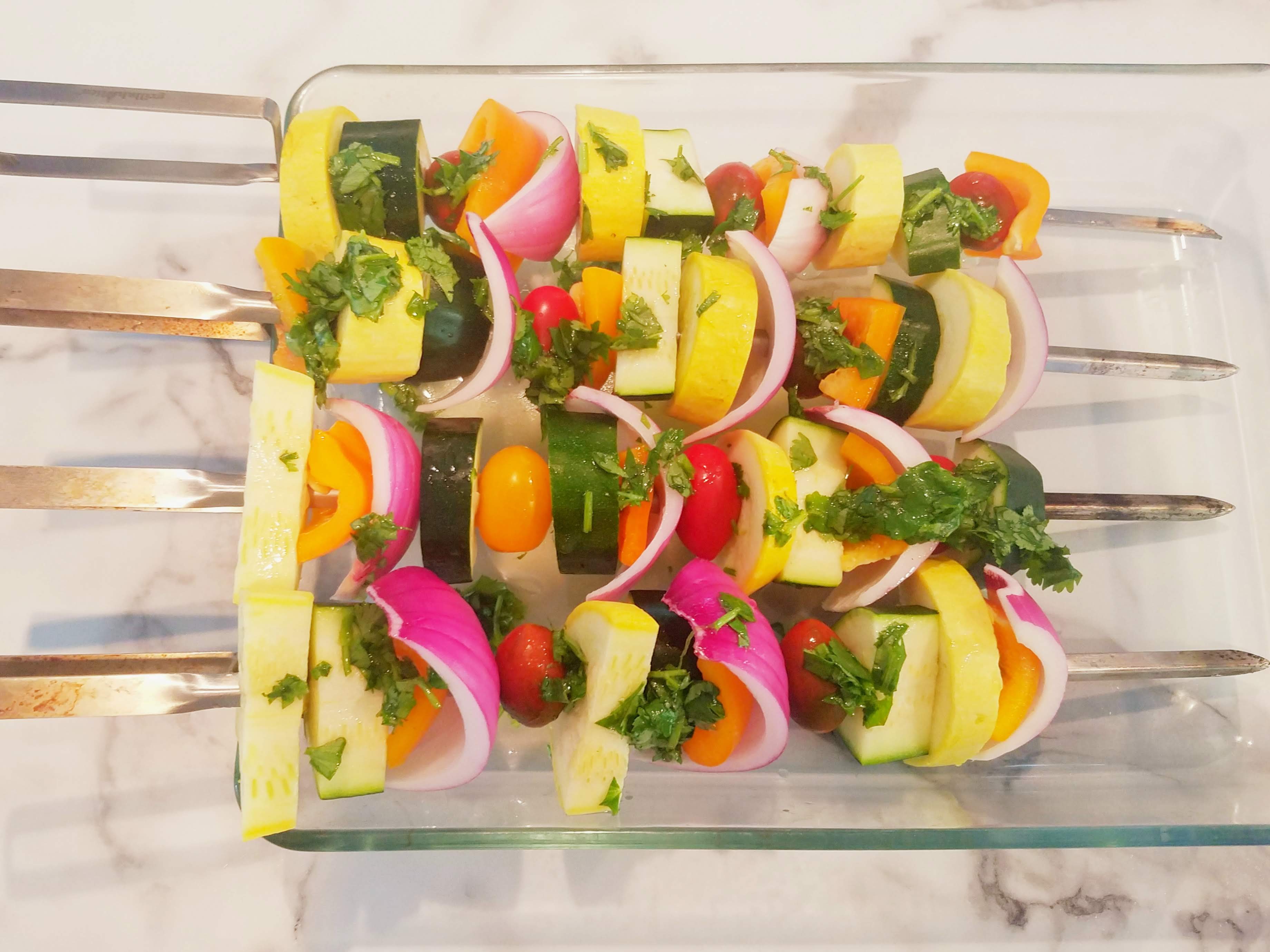 Mix cilantro, oregano, lime juice, olive oil, cumin, chili powder, and salt in a large bowl. Chop vegetables into large chunks and toss with marinade in bowl. Let sit for 15 to 30 minutes if possible to soak up the marinade. Spear the veggies onto skewers and place skewers in a baking dish or rimmed cookie sheet. Pour rest of marinade over the skewers. Grill until tender, turning occasionally to evenly char the veggies. Brush on any excess marinade from the bottom of the dish if they start to get dry. Serve with tortillas, avocados and salsa to make fajitas, or eat plain alongside tortilla chips and salsa. And don’t forget the margaritas!