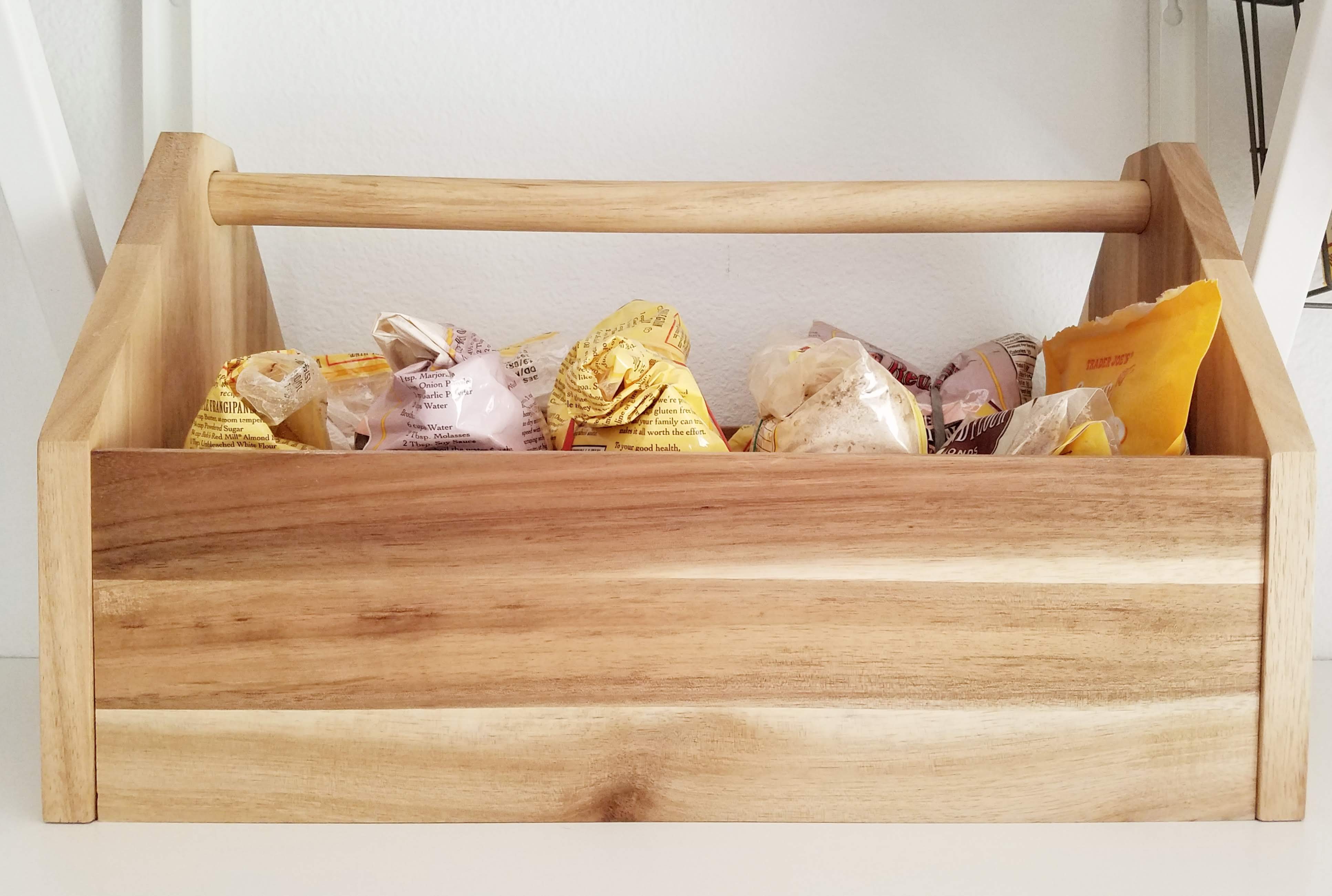 Boxes and crates like this wooden toolbox are handy for storing baking supplies that I don’t use every day. If I’m baking something with a lot of ingredients, the handle makes it easy to bring the whole box into the kitchen. Glass canning jars work well for storing bulk nuts and other dry foods.