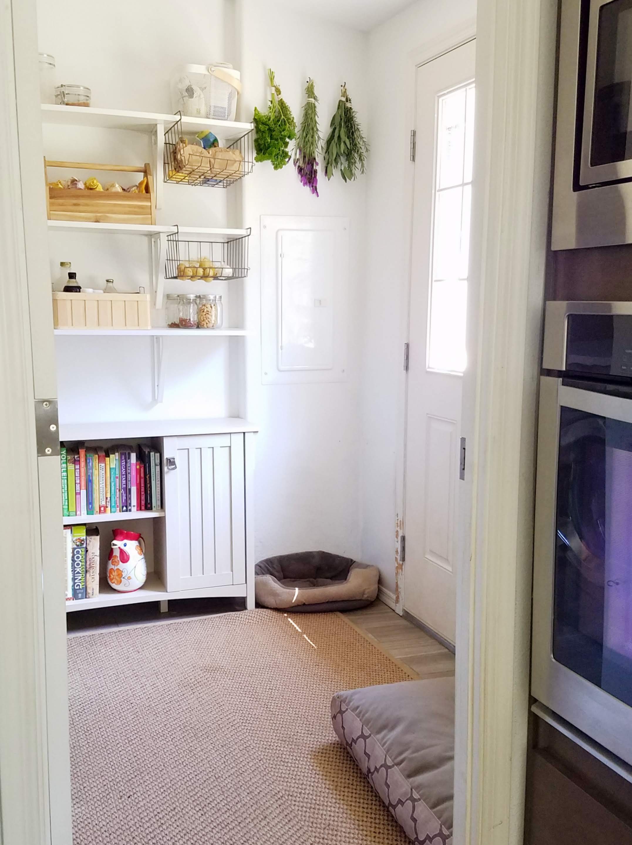 We found a small storage cabinet to hold my cookbooks and hide our unsightly recycling bins. Then we picked up some basic white shelves from IKEA. They also sell these inexpensive wire baskets that clip onto the shelves. They are not the sturdiest things, but I like them because they extend your storage space and provide a good place to keep produce. Small metal mug hooks screwed into the wall provide a perfect spot to hang bunches of drying herbs from our garden.