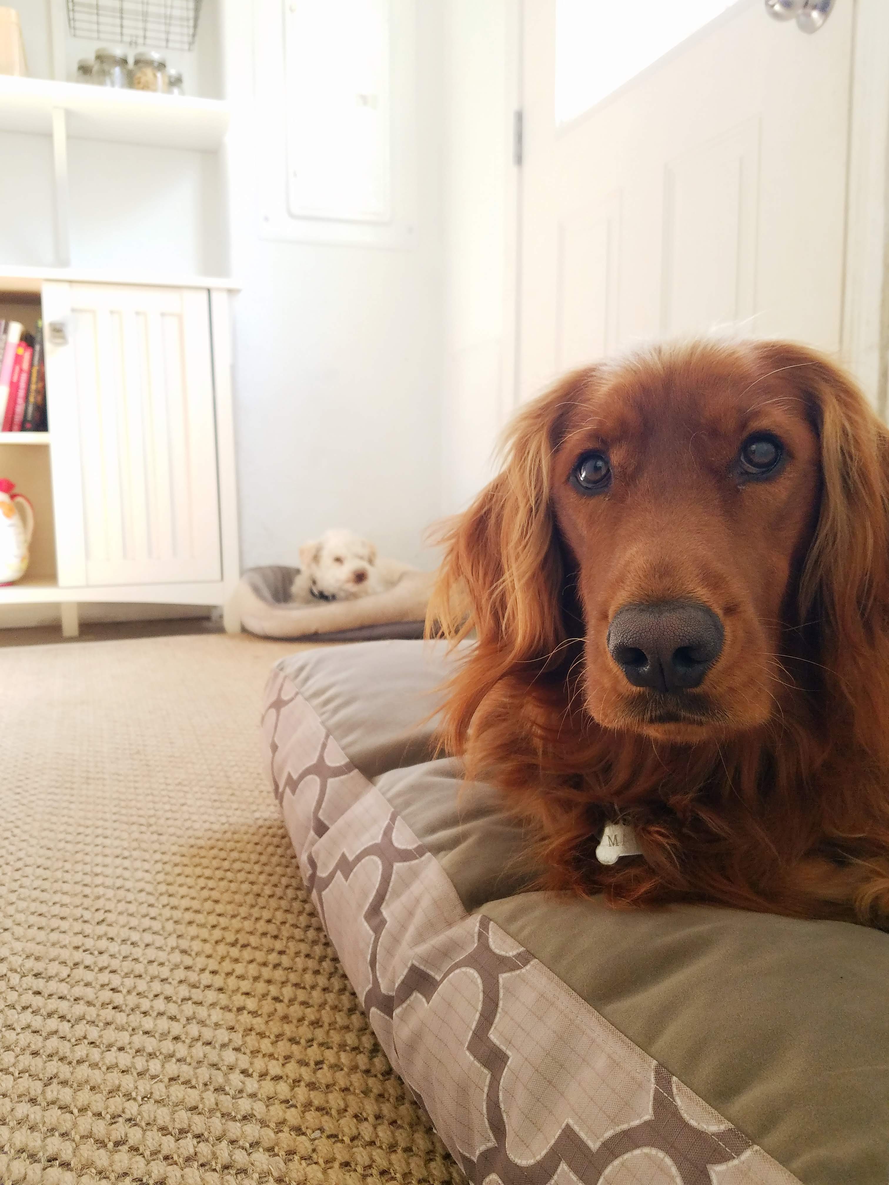 We found a cookie jar at an antique store to use for storing dog treats. Our boys expect a constant supply of treats, so it’s nice to buy them in bulk and have somewhere close at hand to store them. The dogs really love their little room, and when you tell them “It’s time for bed,” they run straight in there. Mars now knows how to pick up his toys from around the house and take them to bed with him (he is very proud of the fact that he can fit three toys in his mouth at once).