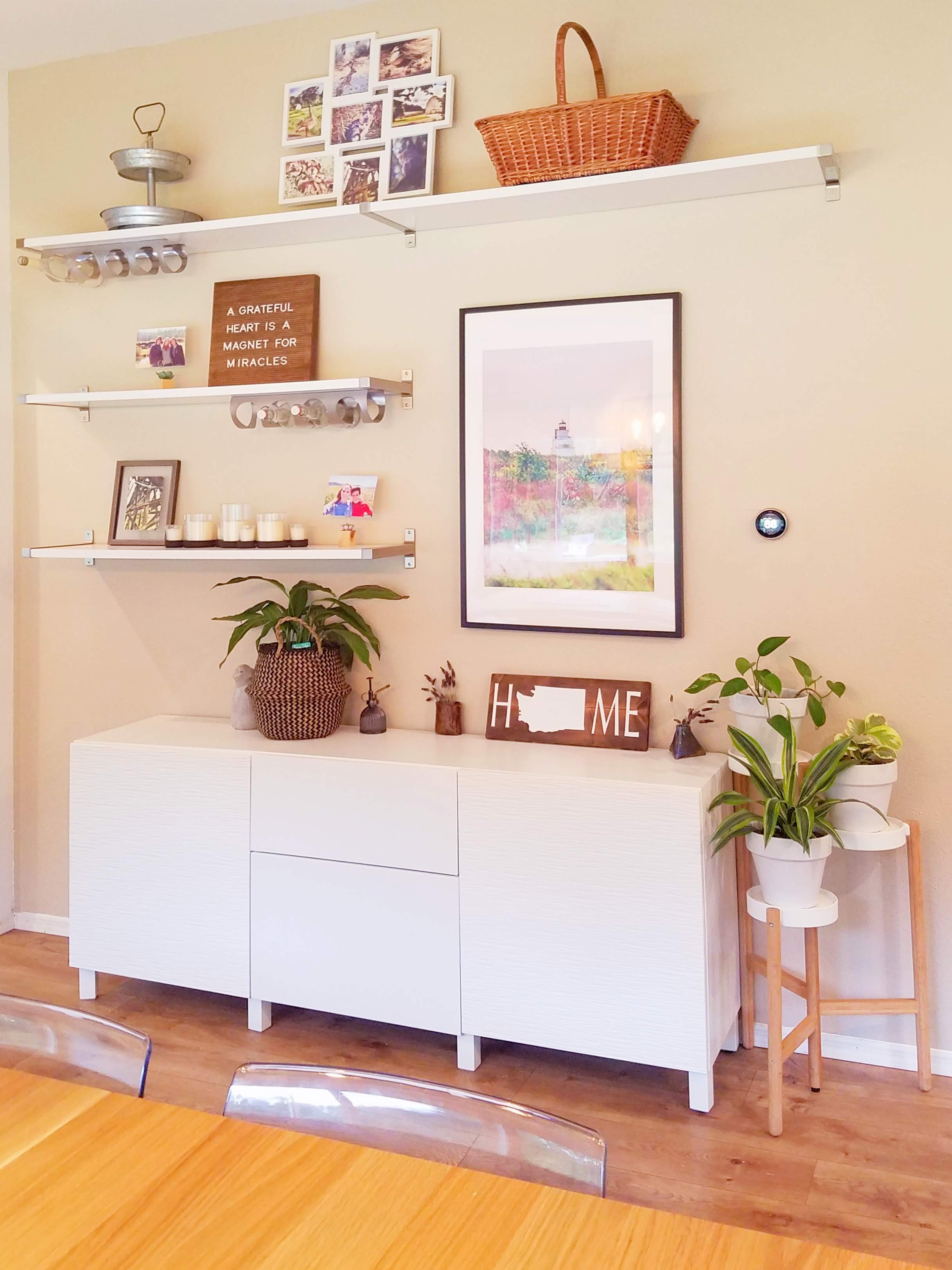 To add even more storage to the dining room, we created a feature wall with some cabinets and shelving. We used pieces from the mix-and-match BESTA series to create a buffet unit that fit our needs. Above this, we hung some open shelves and a framed photograph I had taken of a lighthouse. I use the shelves to display decorative items and enjoy changing them up seasonally.