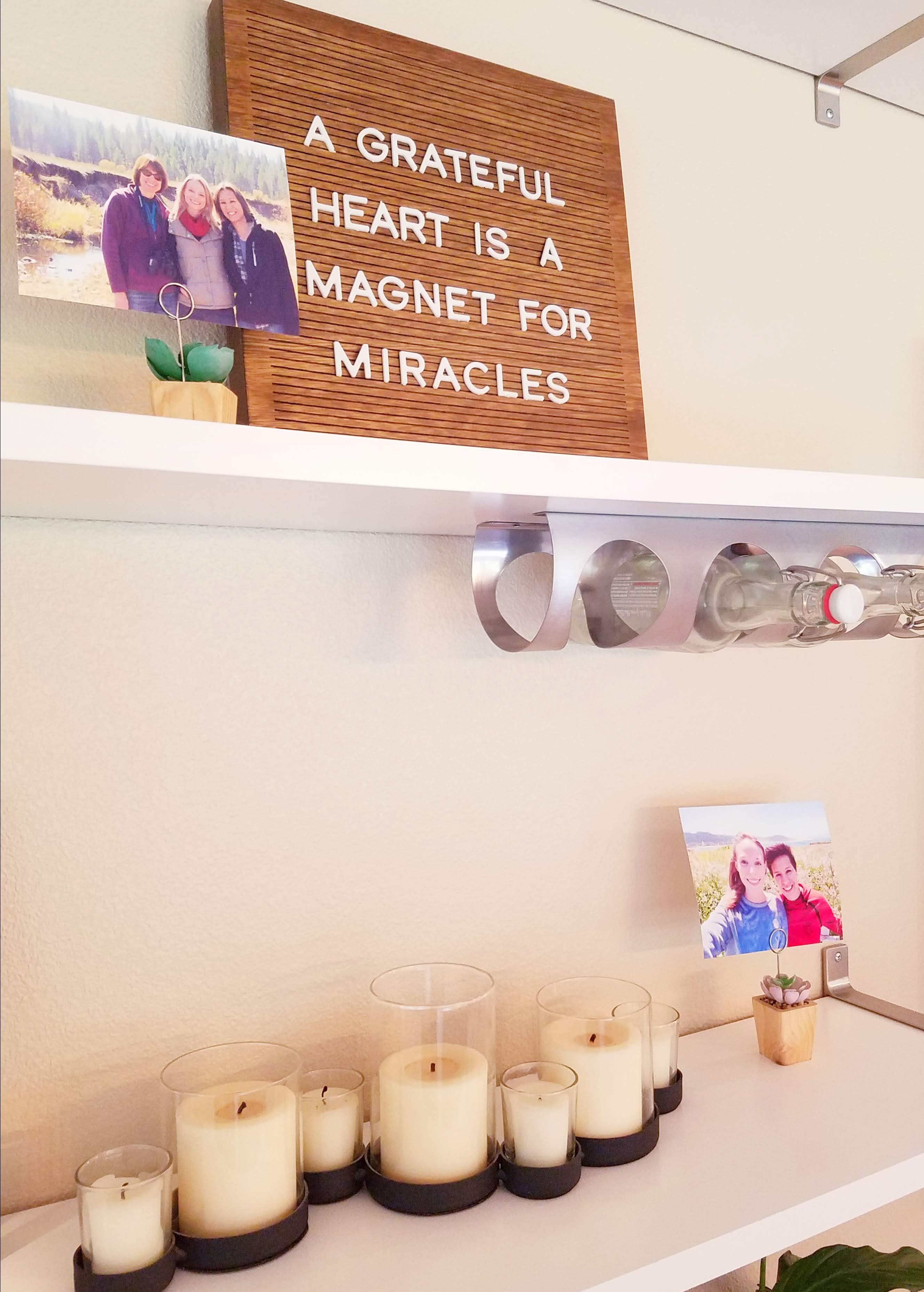 I like to display family photos, artwork, and a letter board, as well as candles, baskets, and serving trays that I use while entertaining. I think open shelving can be both decorative and functional, as long as you use it to store items that have some visual appeal. In other words, you won’t see me storing mismatched mugs or Tupperware on these shelves!