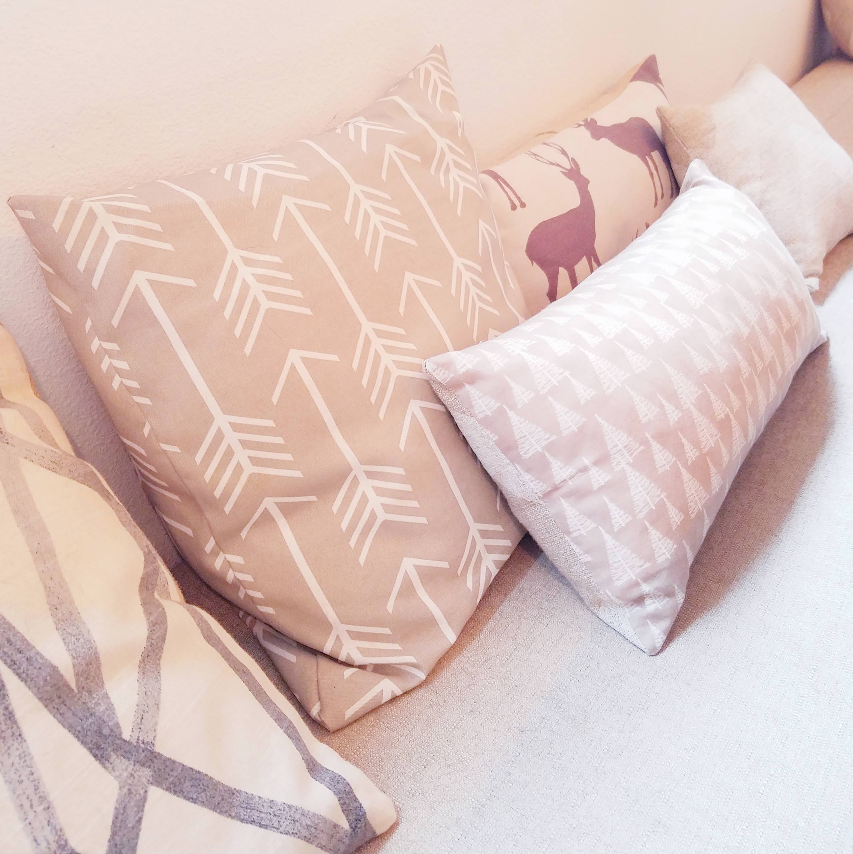 We have banquette bench seating on two sides of our dining table, and this is a big part of what makes the space so comfortable. We started out with three IKEA cubby units laid out in an L shape. My uncle built and helped us upholster a cushioned bench top to fit these units. I chose to upholster them with a beige linen fabric and sewed a bunch of throw pillows with patterned fabrics to match. Not only does this create a comfy space to sit back and lounge at the table (it reminds me of hanging out in a cozy coffee shop), but it’s also an excellent use of space. With banquette seating, you can put the table much closer to the wall since you don’t need space to pull chairs in and out. This enabled us to fit an extra wide dining table in our room. We also put gray felt storage bins in all of the bench cubbies. Since you have to crawl under the table to access most of them, I use them to store things that I don’t need to get out very often, like holiday decorations.